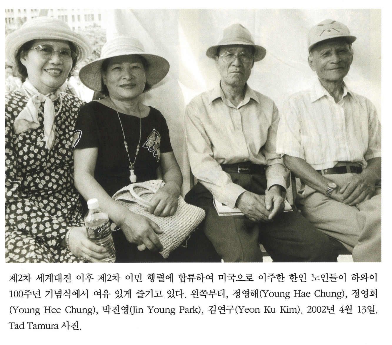 제2차 세계대전 이후 제2차 이민 행렬에 합류하여 미국으로 이주한 한인 노인들이 하와이 100주년 기념식에서 여유 있게 즐기고 있다. 왼쪽부터, 정영해(Young Hae Chung), 정영희(Young Hee Chung), 박진영(Jin Young Park), 김연구(Yeon Ku Kim). 2002년 4월 13일. Tad Tamura 사진.
