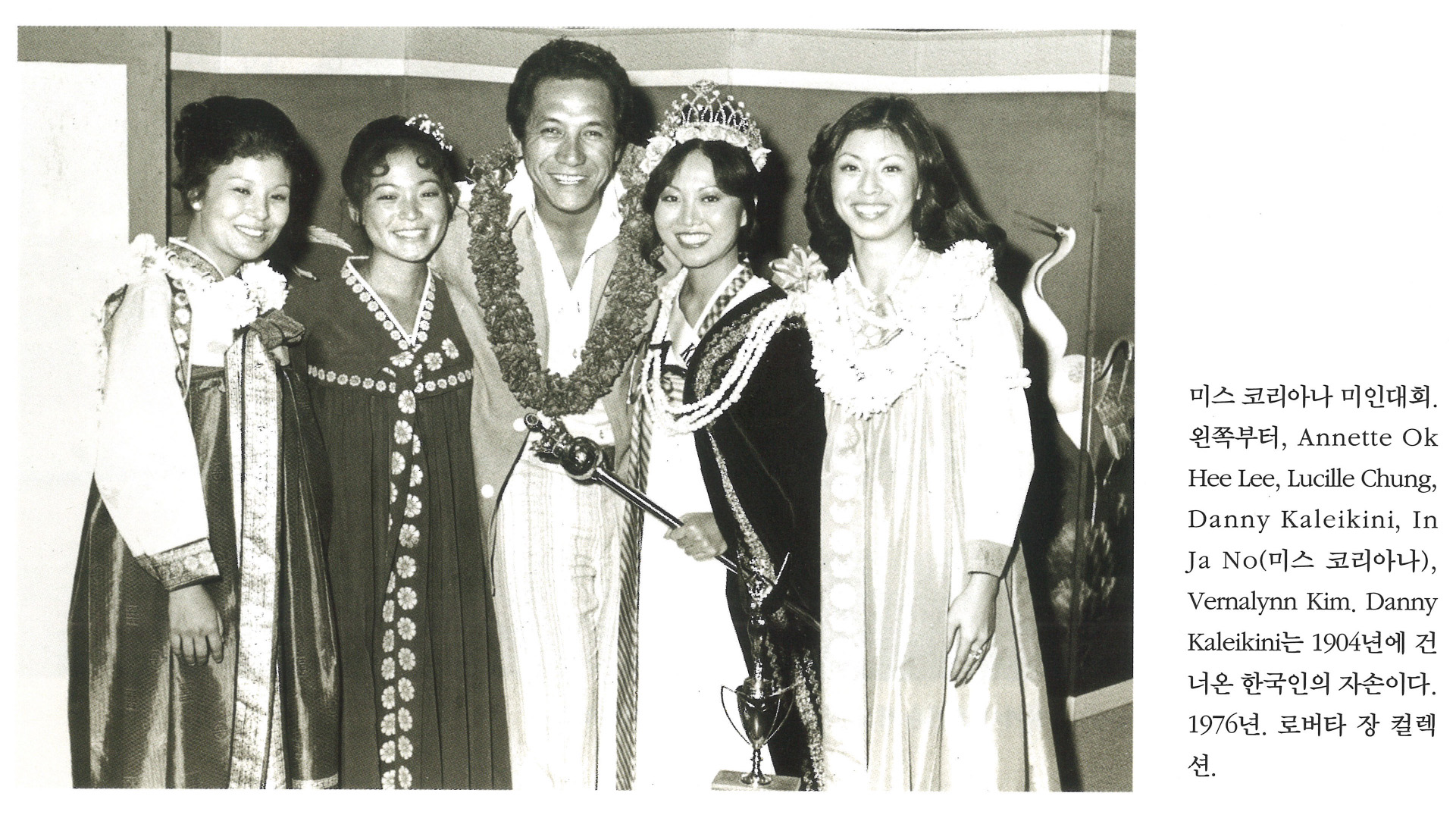 미스 코리아나 미인대회. 왼쪽부터, Annette Ok Hee Lee, Lucille Chung, Danny Kaleikini, In Ja No(미스 코리아나), Vernalynn Kim. Danny Kaleikini는 1904년에 건너온 한국인의 자손이다. 1976년. 로버타 장 컬렉션.