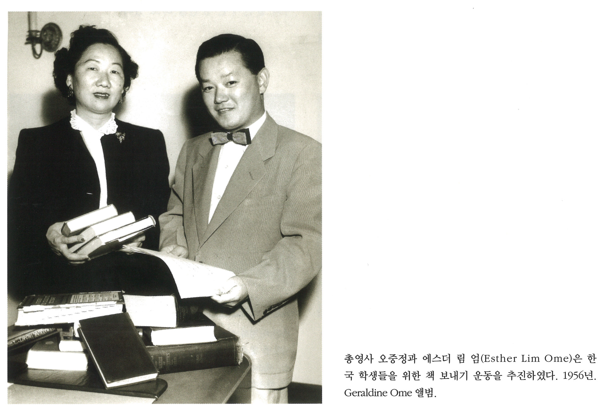 총영사 오중정과 에스더 림 엄(Esther Lim Ome)은 한국 학생들을 위한 책 보내기 운동을 추진하였다. 1956년. Geraladine Ome 앨범.