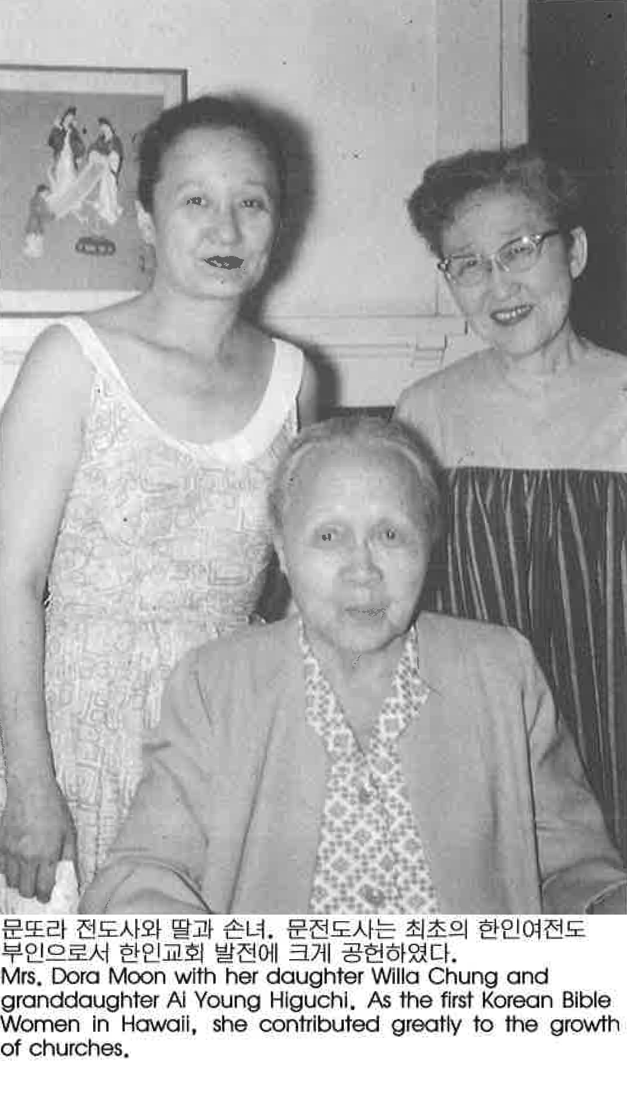 문또라 전도사와 딸과 손녀. 문전도사는 최초의 한인여전도 부인으로서 한인교회 발전에 크게 공헌하였다. Mrs. Dora Moon with her daughter Willa Chung and granddaughter Al Young Higuchl. As the first Korean Bible Women in Hawaii, she contributed greatly to the growth of churches.