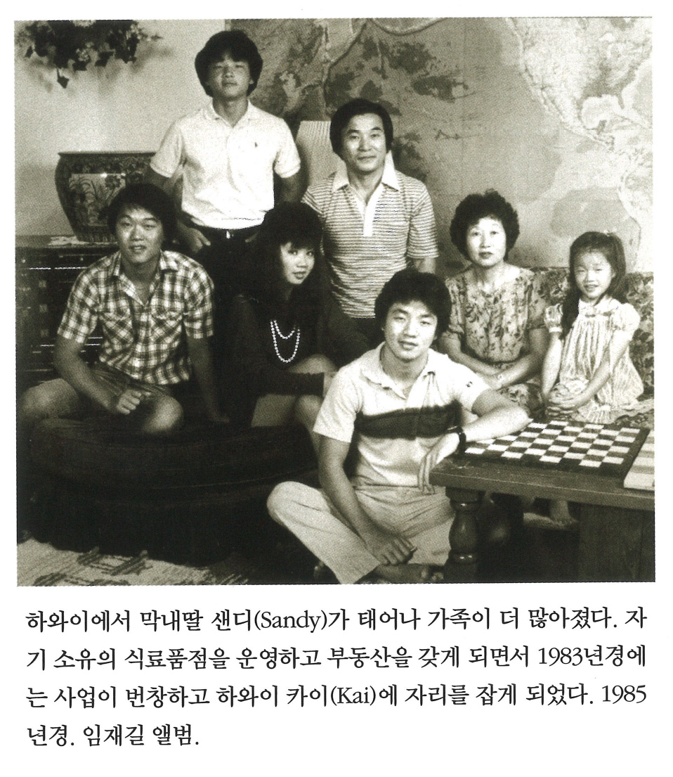 하와이에서 막내딸 샌디(Sandy)가 태어나 가족이 더 많아졌다. 자기 소유의 식료품점을 운영하고 부동산을 갖게 되면서 1983년경에는 사업이 번창하고 하와이 카이(Kai)에 자리를 잡게 되었다. 1985년경. 임재길 앨범.