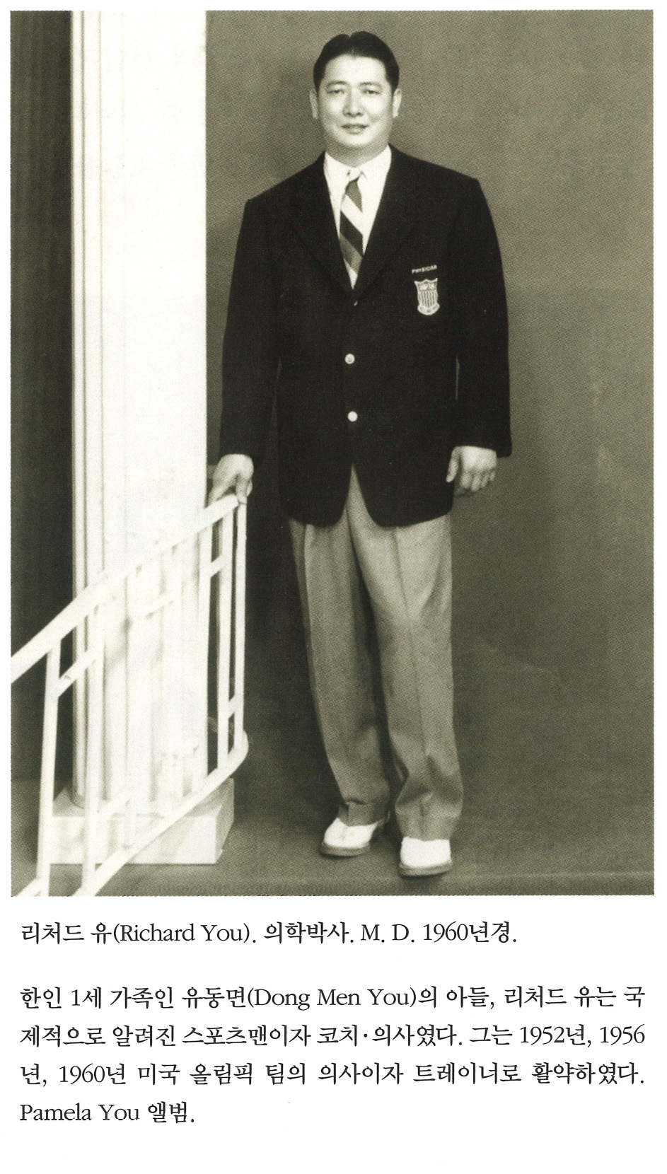 리처드 유(Richard You). 의학박사. M.D. 1960년경. 한인 1세 가족인 유동면(Dong Men You)의 아들, 리처드 유는 국제적으로 알려진 스포츠맨이자 코치·의사였다. 그는 1952년, 1956년, 1960년 미국 올림픽 팀의 의사이자 트레이너로 활약하였다. Pamela You 앨범.