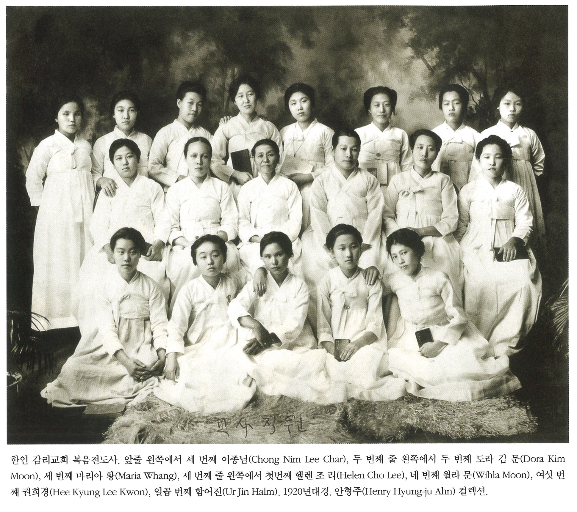 한인 감리교회 복음전도사. 앞줄 왼쪽에서 세 번째 이종님(Chong Nim Lee Char), 두 번째 줄 왼쪽에서 두 번째 도라 김 문(Dora Kim Moon), 세 번째 마리아 황(Maria Whang), 세 번째 줄 왼쪽에서 첫 번째 헬렌 조 리(Helen Cho Lee), 네 번째 윌라 문(Wihla Moon), 여섯 번째 권희경(Hee Kyung Lee Kwon), 일곱 번째 함어진(Ur Jin Halm). 1920년대경. 안형주(Henry Hyung-ju Ahn) 컬렉션.