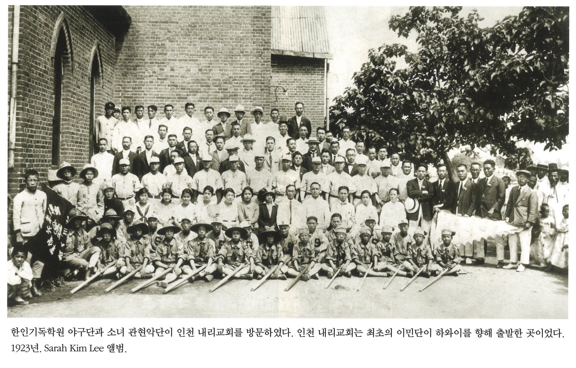 한인기독학원 야구단과 소녀 관현악단이 인천 내리교회를 방문하였다. 인천 내리교회는 최초의 이민단이 하와이를 향해 출발한 곳이었다. 1923년. Sarah Kim Lee 앨범.