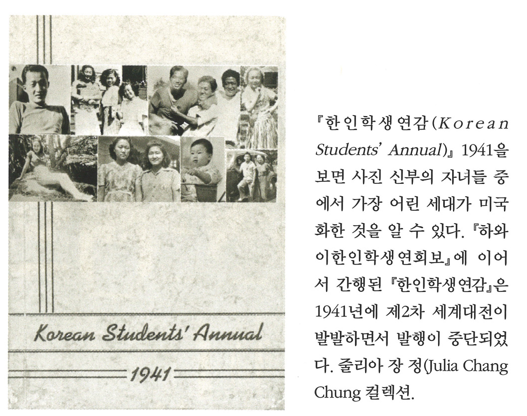 『한인학생연감(Korean Student's Annual) 』 1941을 보면 사진 신부의 자녀들 중 가장 어린 세대가 미국화 한 것을 알 수 있다. 『 하와이한인학생연회보』에 이어서 간행된 『 한인학생연감』은 1941년에 제2차 세계대전이 발발하면서 발행이 중단되었다. 줄리아 장 정(Julia Chang Chung) 컬렉션.
