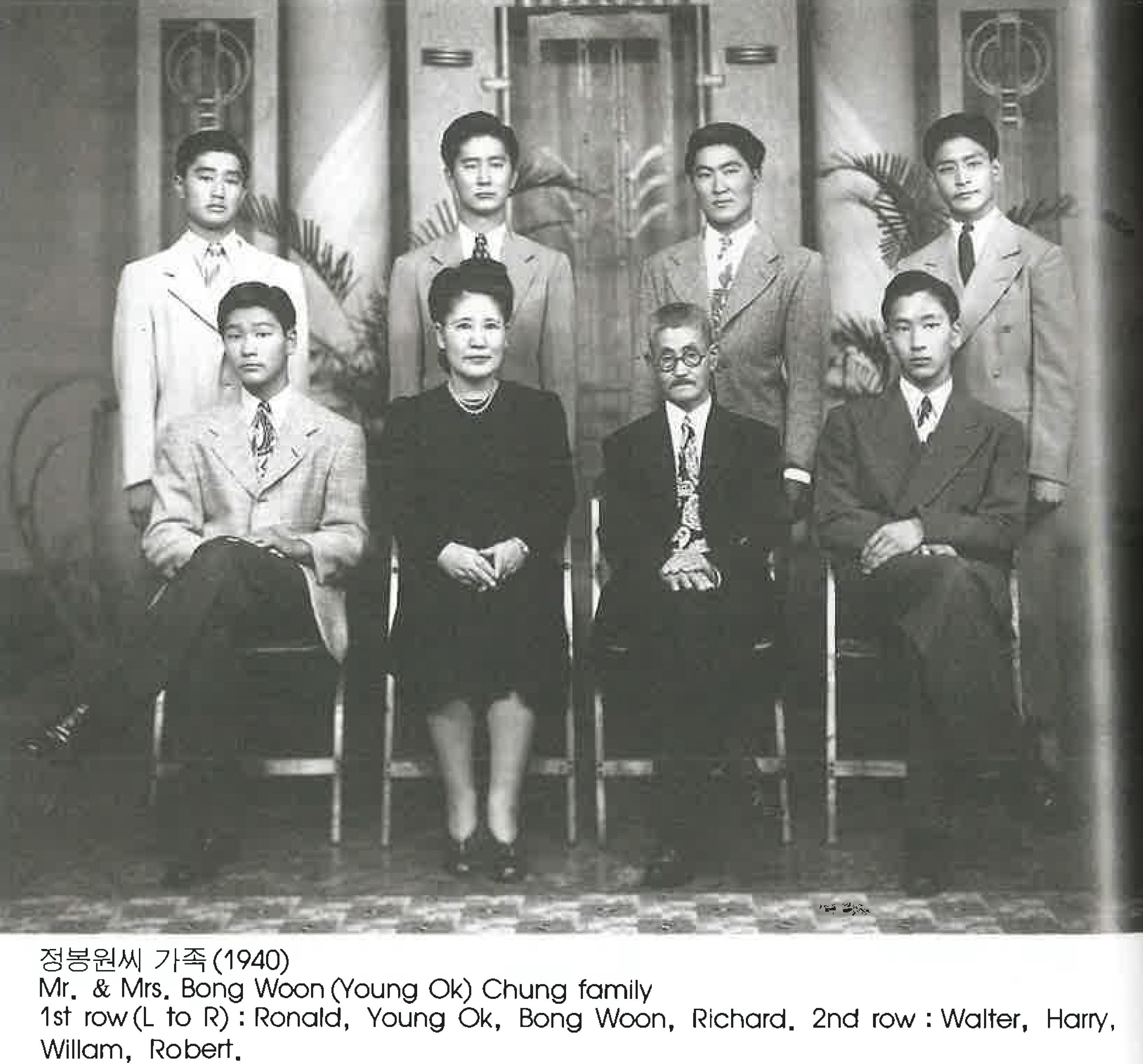 정봉원씨 가족(1940) Mr. & Mrs. Bong Woon (Young Ok) Chung family 1st row(L to R): Ronald, Young Ok, Bong Woon, Richard. 2nd row : Walter, Harry, Wiliam, Robert.