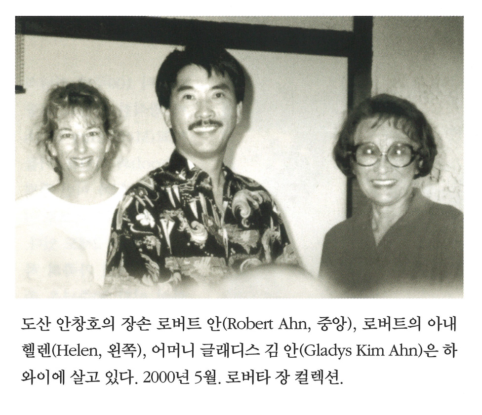 도산 안창호의 장손 로버트 안(Robert Ahn, 중앙), 로버트의 아내 헬렌(Helen, 왼쪽), 어머니 글래디스 김 안(Gladys Kim Ahn)은 하와이에 살고 있다. 2000년 5월. 로버타 장 컬렉션.