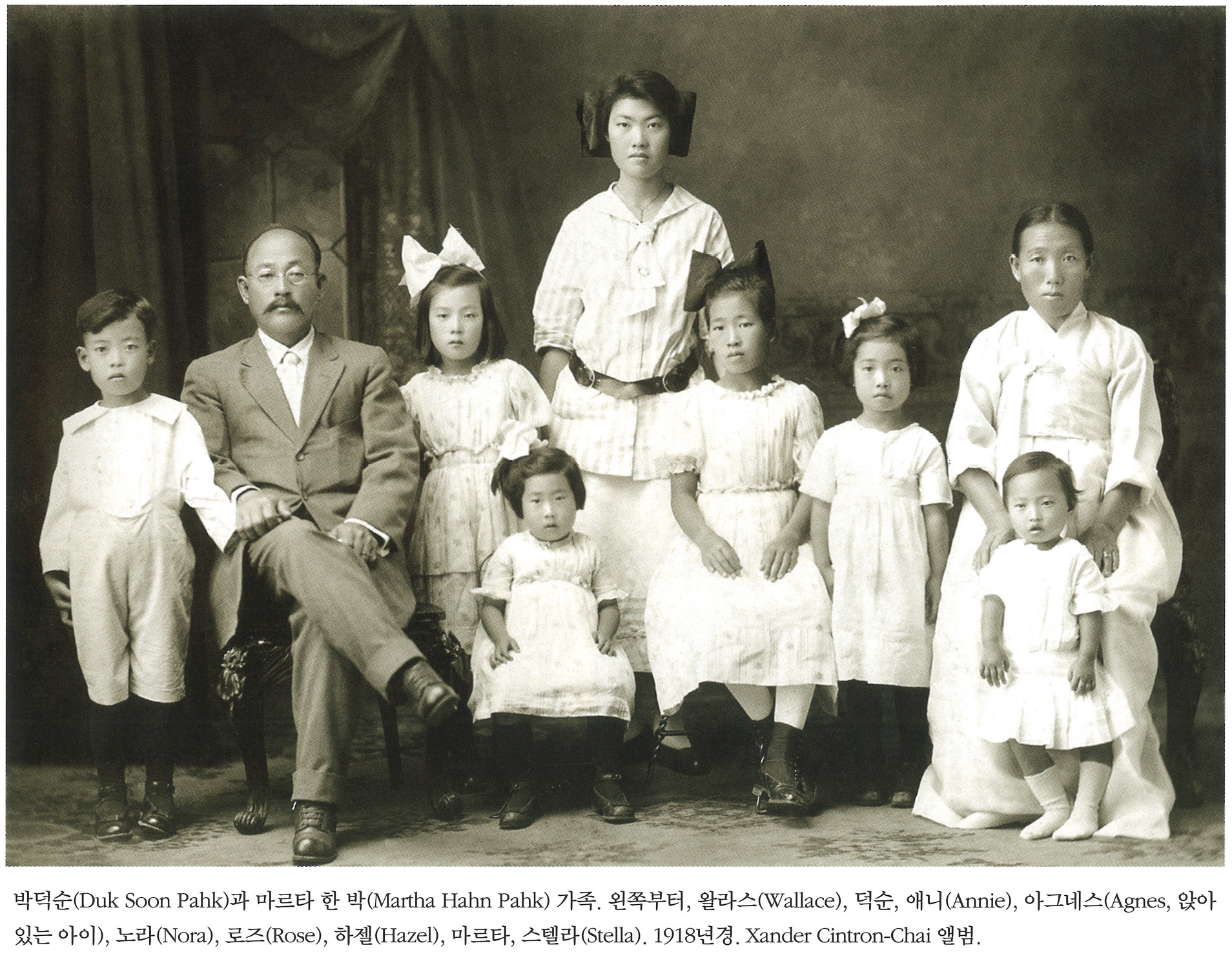 왼쪽부터, 왈라스(Wallace), 덕순, 애니(Annie), 아그네스(Agnes,앉아있는 아이), 노라(Nora), 로즈(Rose), 하젤(Hazel), 마르타, 스텔라(Stella). 1918년경. Xander Cintron-Choi 앨범.