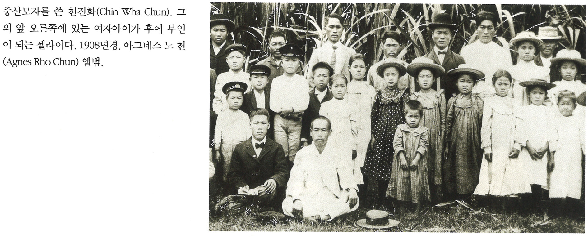 중산모자를 쓴 천진화(Chin Wha Chun). 그의 앞 오른쪽에 있는 여자아이가 후에 부인이 되는 셀라이다. 1908년경. 아그네스 노 천(Agnes Rho Chun) 앨범.