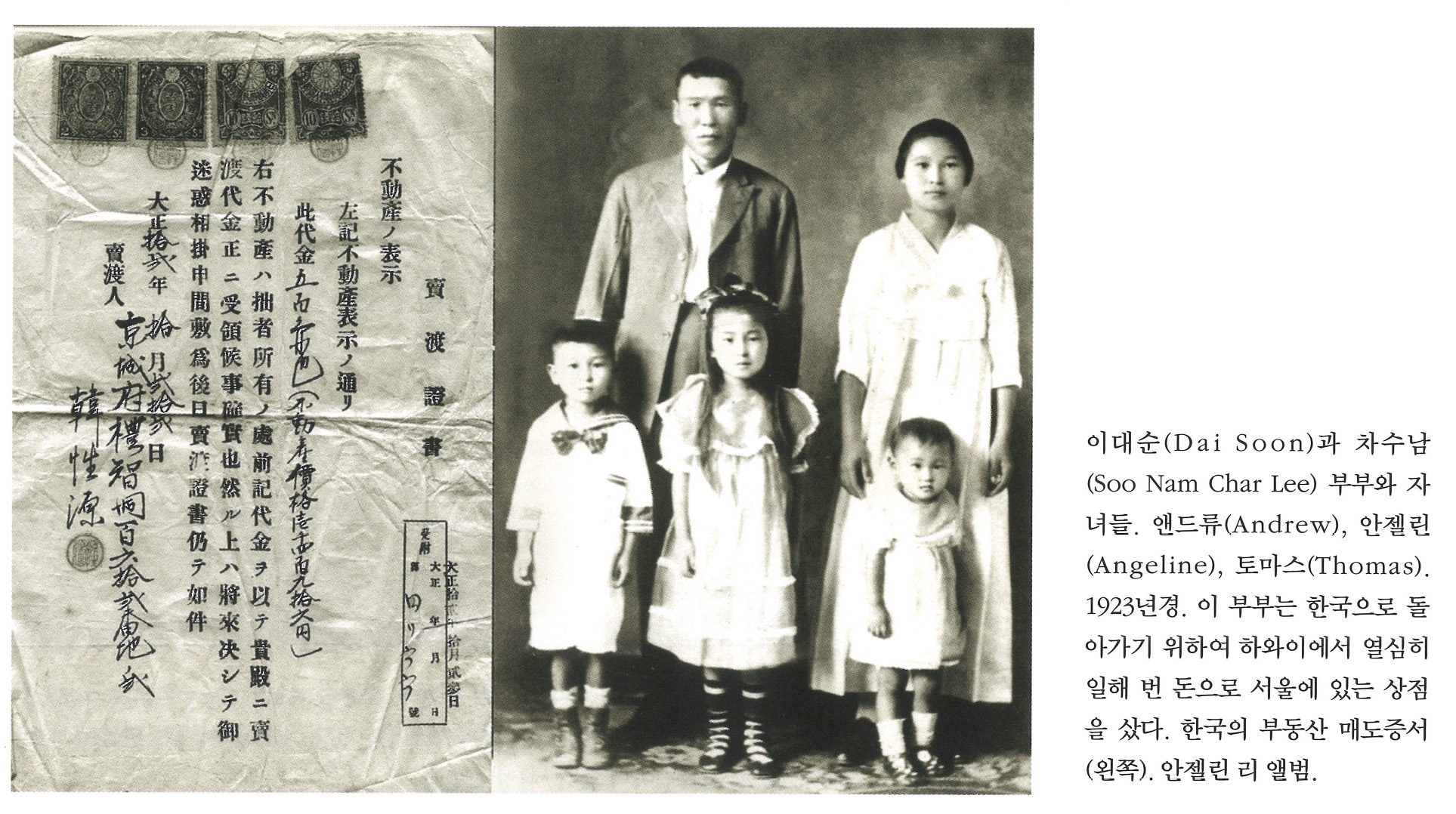 이대순(Dai Soon)과 차순남 부부와 자녀들. 앤드류(Andrew), 안젤린(Angeline), 토마스(Thomas). 1923년경. 이 부부는 한국으로 돌아가기 위하여 하와이에서 열심히 일해 번 돈으로 서울에 있는 상점을 샀다. 한국의 부동산 매도증서(왼쪽). 안젤린 리 앨범.